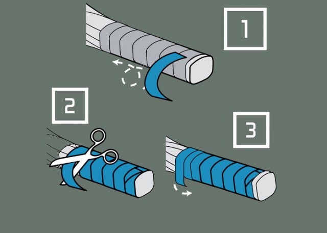 Hay que enrollar el overgrip al mango despacio, girando la pala, y cubrir parte de la cinta ya puesta según vamos dándole vueltas a la pala.